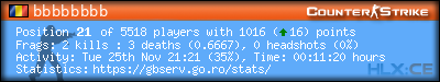 | Rank | Server | Kills | % | Ratio | Deaths | K:D | Headshots | Percentage of Headshots | % | HS:K |