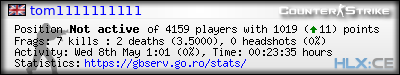 | Rank | Name | Time | Last Use | Kills | Deaths | K:D | Headshots | HS:K | Suicides | Accuracy |