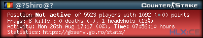 | 1 | @?Shiro@? | 0d 00:03:21h | 2024-08-26 17:39:32 | 0 | 0 | 0.00 | 0 | - | 0 | 0.0% |