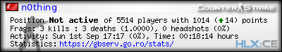| Rank | Name | Time | Last Use | Kills | Deaths | K:D | Headshots | HS:K | Suicides | Accuracy |