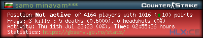| 2 | FleshasCS | Player | 0d 02:53:18h | 2024-07-11 23:12:42 | 2 | 5 | 0.40 | 0 | 0.00 | 0 | 17.1% |