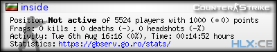 | Rank | Name | Time | Last Use | Kills | Deaths | K:D | Headshots | HS:K | Suicides | Accuracy |