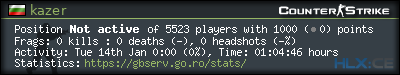 | Rank | Name | Time | Last Use | Kills | Deaths | K:D | Headshots | HS:K | Suicides | Accuracy |