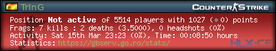 | Rank | Name | Time | Last Use | Kills | Deaths | K:D | Headshots | HS:K | Suicides | Accuracy |
