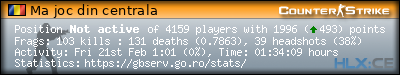 | 1 | Ma joc din centrala | 0d 01:34:09h | 2025-02-21 01:05:45 | 103 | 131 | 0.79 | 39 | 0.38 | 0 | 8.5% |