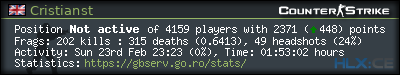 | 1 | Cristianst | 0d 01:53:02h | 2025-02-23 23:52:40 | 202 | 315 | 0.64 | 49 | 0.24 | 0 | 11.2% |