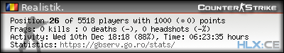 | Rank | Name | Time | Last Use | Kills | Deaths | K:D | Headshots | HS:K | Suicides | Accuracy |