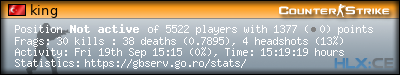 | 1 | king | 0d 15:05:57h | 2025-09-19 15:10:41 | 30 | 38 | 0.79 | 4 | 0.13 | 0 | 12.5% |