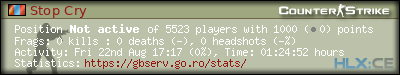 | Rank | Name | Time | Last Use | Kills | Deaths | K:D | Headshots | HS:K | Suicides | Accuracy |