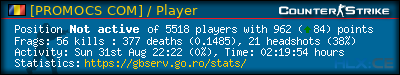 | 1 | [PROMOCS COM] / Player | 0d 01:27:27h | 2025-08-31 22:27:12 | 36 | 274 | 0.13 | 9 | 0.25 | 0 | 9.0% |