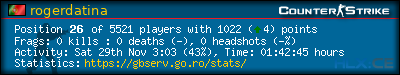 | Rank | Name | Time | Last Use | Kills | Deaths | K:D | Headshots | HS:K | Suicides | Accuracy |