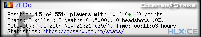 | Rank | Server | Kills | % | Ratio | Deaths | K:D | Headshots | Percentage of Headshots | % | HS:K |
