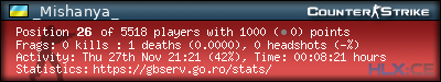 | Rank | Server | Kills | % | Ratio | Deaths | K:D | Headshots | Percentage of Headshots | % | HS:K |
