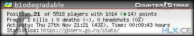 | Rank | Server | Kills | % | Ratio | Deaths | K:D | Headshots | Percentage of Headshots | % | HS:K |