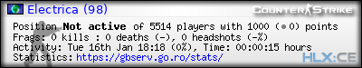 | Rank | Name | Time | Last Use | Kills | Deaths | K:D | Headshots | HS:K | Suicides | Accuracy |