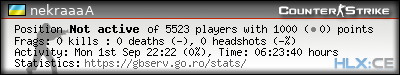 | Rank | Name | Time | Last Use | Kills | Deaths | K:D | Headshots | HS:K | Suicides | Accuracy |