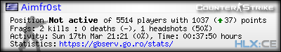 | Rank | Name | Time | Last Use | Kills | Deaths | K:D | Headshots | HS:K | Suicides | Accuracy |